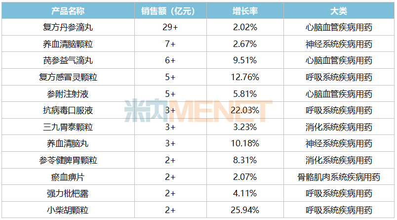 2025年Q1-Q3在中国三大终端六大市场,华润三九的中成药TOP20产品合揽超过125亿元。超10亿产品占了2个,其中复方丹参滴丸大卖了29亿元,增长率为2.02%;其余18个中成药销售额在2亿元以上,其中11个有正增长,抗病毒口服液和小柴胡颗粒增长率超过20%,复方感冒灵颗和养血清脑丸增长率超过10%。