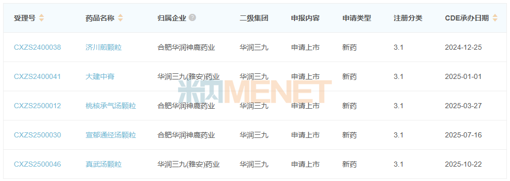 米内网数据显示,目前华润三九旗下还有5款古代经典名方报产在审。济川煎颗粒在2024年年底报产,预计在2026年1月迎来好消息,大建中膏、桃核承气汤颗粒、宣郁通经汤颗粒、真武汤颗粒均为今年报产。