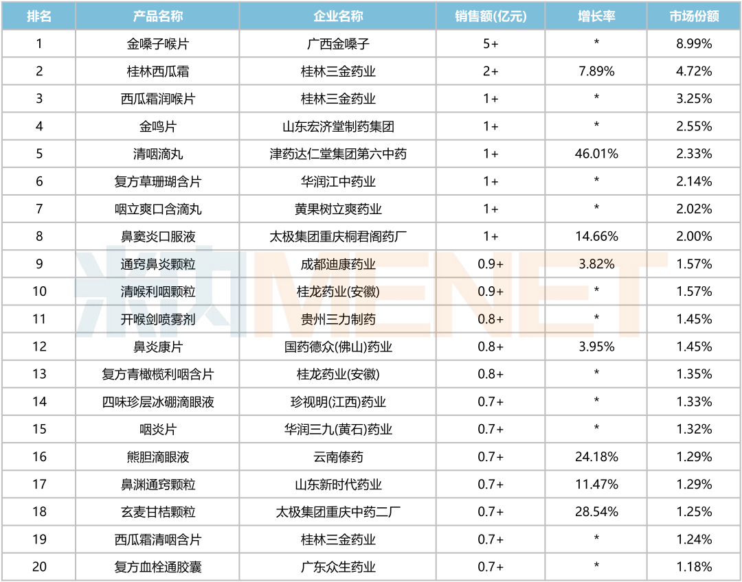 五官科中成药品牌TOP20中,广西金嗓子的金嗓子喉片已连续多年位列第一,也是唯一销售额突破5亿元的上榜品牌;桂林三金药业的桂林西瓜霜和西瓜霜润喉片、山东宏济堂制药的金鸣片均为榜单的“常客”,分别以超1.5亿元的销售额位列第二至第四;津药达仁堂的清咽滴丸、华润江中药业的复方草珊瑚含片、黄果树立爽药业的咽立爽口含滴丸销售额均超1.2亿元,排在第五至第七。