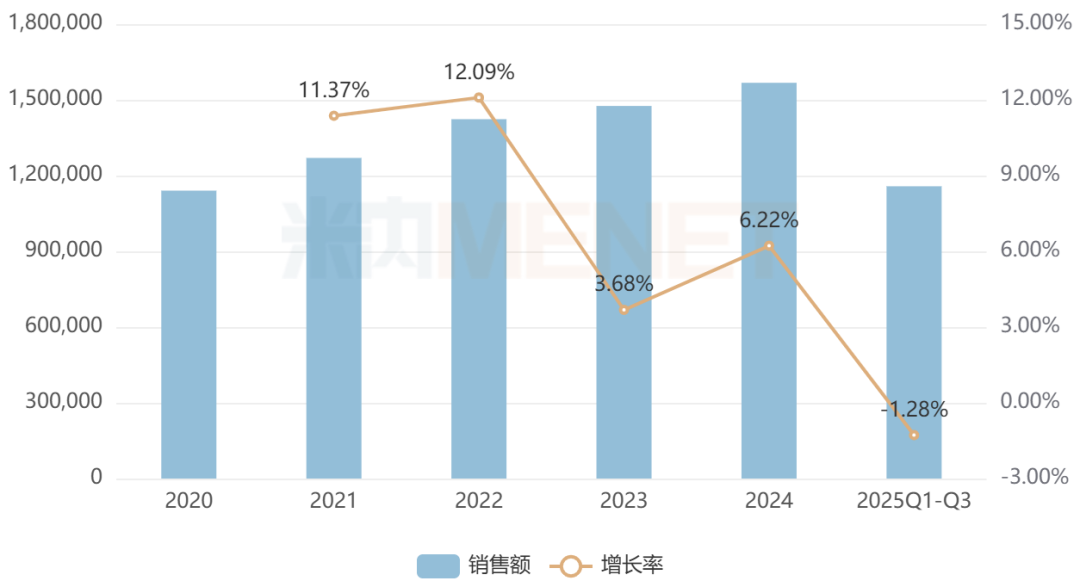 五官科中成药因辨证施治准、整体调理优、温和低毒副等临床优势而被广泛应用。米内网数据显示,五官科中成药2021-2024年在中国三大终端六大市场(统计范围详见本文末)销售额均呈逐年递增之势,2024年拿下创新高的超150亿元,2025Q1~Q3略有回落至超115亿元。