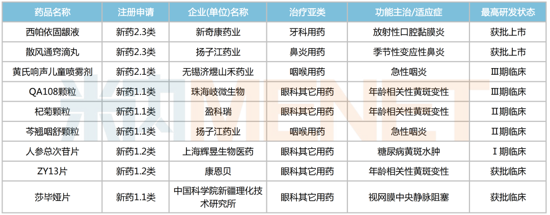 2021年以来,有9款五官科中药新药先后获批临床,包括4款1.1类新药、2款1.2类新药、1款2.1类新药和2款2.3类新药。其中,珠海岐微生物的1.1类新药QA108颗粒(年龄相关性黄斑变性)、无锡济煜山禾药业的2.1类新药黄氏响声儿童喷雾剂(急性咽炎)均已步入Ⅲ期临床,盈科瑞的1.1类新药杞菊颗粒(年龄相关性黄斑变性)、扬子江药业的1.1类新药芩翘咽舒颗粒(急性咽炎)均已步入Ⅱ期临床,申报NDA指日可待。
