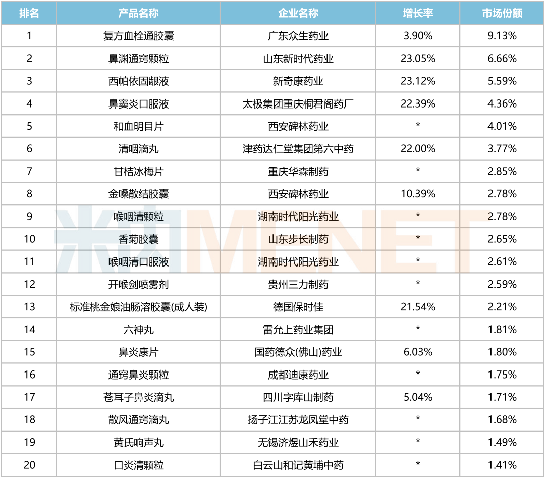 15个五官科独家中成药上榜,包括桂林三金药业的桂林西瓜霜、西瓜霜润喉片和西瓜霜清咽含片、太极集团的鼻窦炎口服液、广西金嗓子的金嗓子喉片、桂龙药业的复方青橄榄利咽含片、华润江中药业的复方草珊瑚含片、山东新时代药业的鼻渊通窍颗粒等。