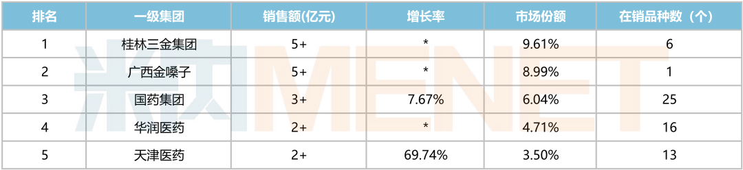 2025Q1~Q3中国零售药店终端五官科中成药一级集团格局中,TOP5一级集团分别为桂林三金集团、广西金嗓子、国药集团、华润医药和天津医药。其中,桂林三金集团市场份额超9%,天津医药的销售额增速达69.74%。
