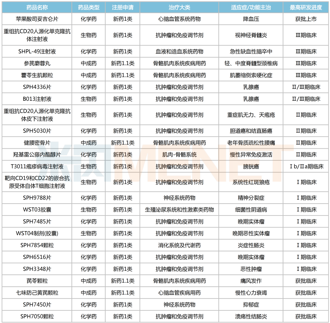 24款1类新药覆盖心脑血管、骨骼肌肉、肿瘤、神经、消化、血液和造血等疾病领域。其中,苹果酸司妥吉仑片于近日获批上市,用于原发性高血压;重组抗CD20人源化单克隆抗体注射液(视神经脊髓炎)、SHPL-49注射液(缺血性脑卒中)、参芪麝蓉丸(脊髓型颈椎病)、藿苓生肌颗粒(肌萎缩侧索硬化症)均已步入Ⅲ期临床,SPH4336片(乳腺癌)、B013注射液(乳腺癌)均处于Ⅱ/Ⅲ期临床阶段,上市可期。