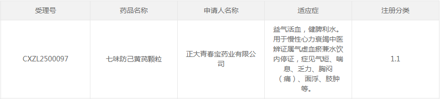 七味防己黄芪颗粒是由上海医药下属公司正大青春宝药业开发的中药1.1类新药,功能主治益气活血、健脾利水,拟用于慢性心力衰竭中医辨证属气虚血瘀兼水饮内停证,症见气短、喘息、乏力、胸闷(痛)、面浮、肢肿等。
