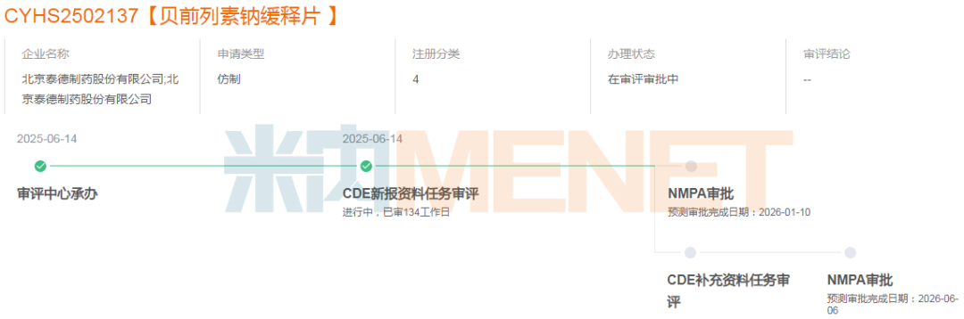 仿制药研发方面,北京泰德制药有2款产品以新分类报产在审,分别是妥洛特罗贴剂和贝前列素钠缓释片。其中,前者最早于2025年1月获批上市,为国内首仿+首家过评;后者于2025年6月提交上市申请获受理,米内网预测其有望于2026年6月传来喜讯,冲刺首仿及首家过评。