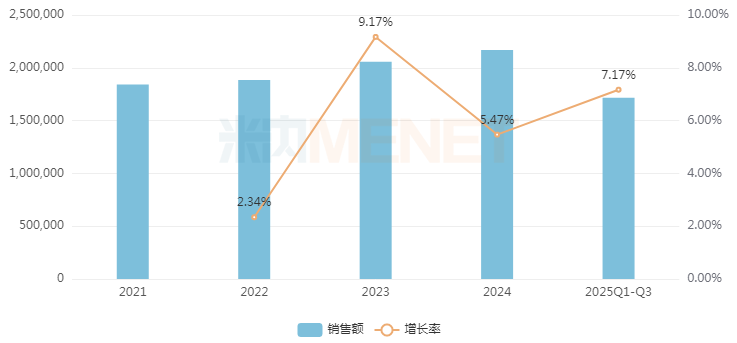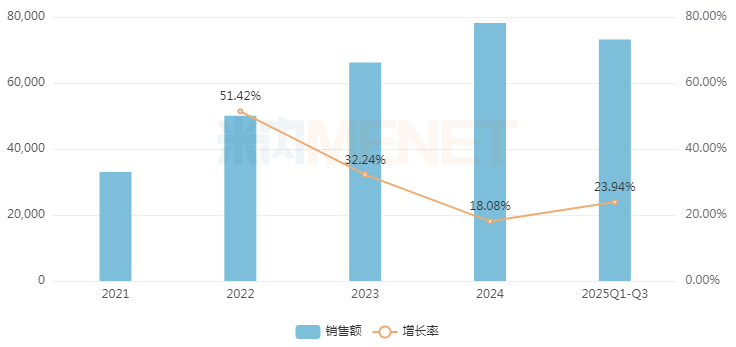 在中国三大终端六大市场(统计范围详见本文末),局部用麻醉化药近年来销售额逐年攀升,2022-2024年先后突破5亿元、6亿元和7亿元,同比增长51.42%、32.24%和18.08%;2025Q1~Q3继续以23.94%的增速增长至超7.3亿元,全年有望向10亿元大关发起冲击。