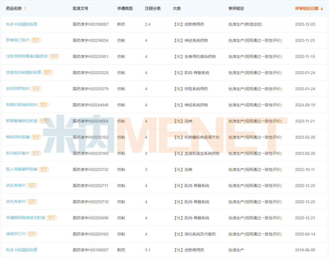 13个已上市的品种中,公司的利斯的明透皮贴剂、利马前列素片(首家过评)、妥洛特罗贴剂(首家过评)等为国内首仿,吸入用氯醋甲胆碱、苯磺顺阿曲库铵注射液、罗替高汀贴片等为国产第2家,依托考昔片、维格列汀片、洛索洛芬钠凝胶贴膏等为国产第3家,彰显了公司研发实力。