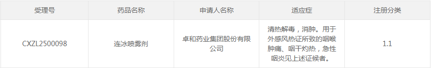 连冰喷雾剂由卓和药业开发,功能主治清热解毒、消肿,拟用于外感风热证所致的咽喉肿痛、咽干灼热,急性咽炎见上述证候者,是国内首款1.1类中药喷雾剂产品。米内网数据显示,该新药的临床申请(CXZL2500098)于2025年10月获得承办,并于近日获得临床试验默示许可。