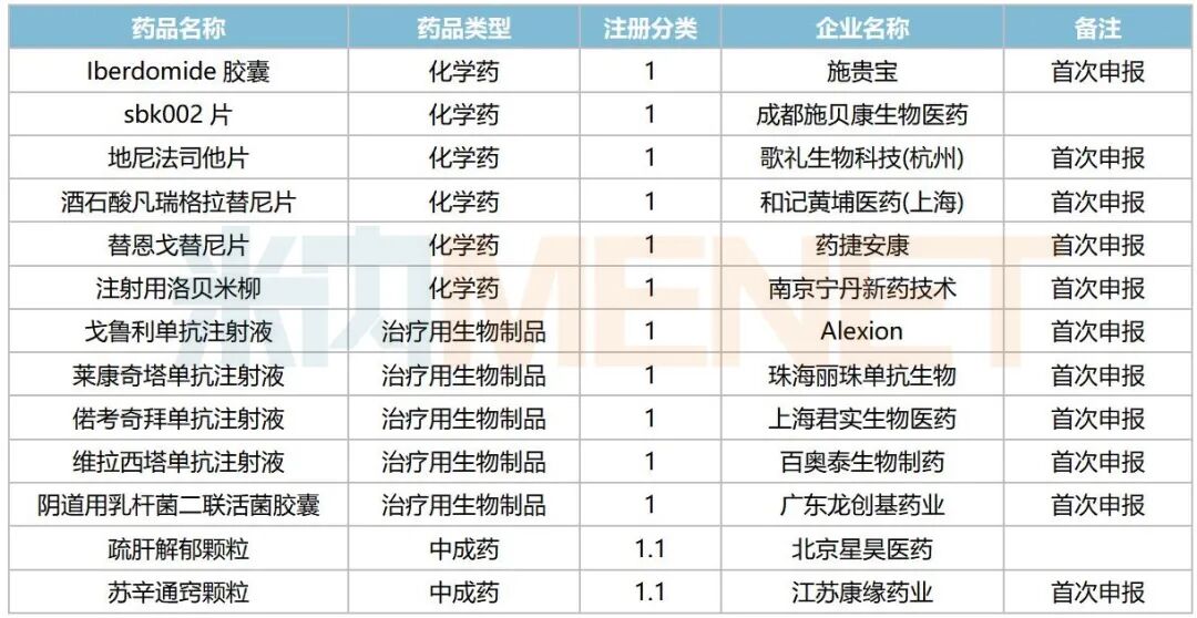 2025年12月有13个1类新药申请上市,化学药有6个,生物制品有5个,中成药有2个,除成都施贝康生物医药的sbk002片和北京星昊医药的疏肝解郁颗粒不是首次申报外,其他品种均为首次申报。