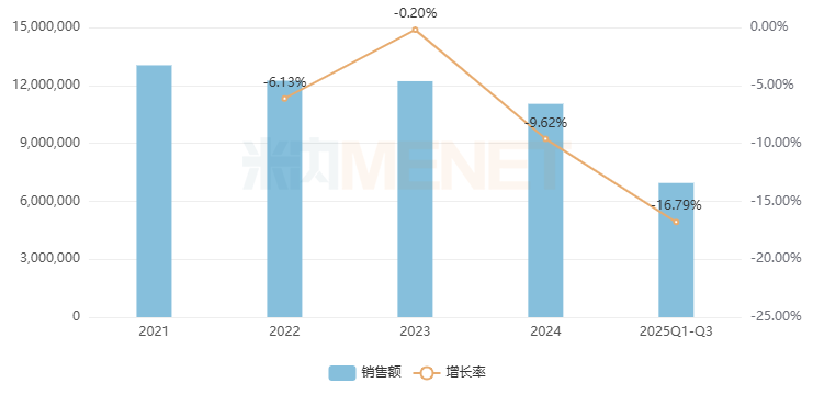 在中国三大终端六大市场(统计范围见文末),全身用抗细菌药的销售额自2022年起持续下滑,市场岌岌可危,2024年整体规模跌至1100亿元,2025年Q1-Q3跌幅高达16.79%,新药入局有望提振市场。