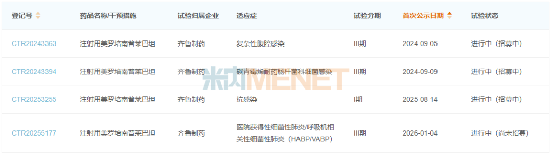 米内网数据显示,注射用美罗培南普莱巴坦的复杂性腹腔感染的III期临床于2024年11月完成首例受试者入组,而碳青霉烯耐药肠杆菌科细菌感染的III期临床也在2025年4月完成首例受试者入组,本次启动III期临床的适应症为医院获得性细菌性肺炎/呼吸机相关性细菌性肺炎(HABP/VABP),该新药有着超强的市场潜力。