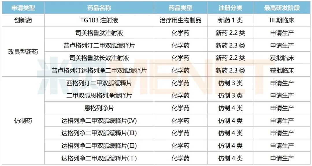 在研产品中,1类新药TG103注射液(GLP-1受体激动剂)处于III期临床,包括超重/肥胖、2型糖尿病等适应症;2类新药方面,司美格鲁肽注射液、普卢格列汀二甲双胍缓释片均已申报上市等;仿制药方面,西格列汀二甲双胍缓释片、二甲双胍恩格列净缓释片、恩格列净片、达格列净二甲双胍缓释片(Ⅰ、Ⅱ、Ⅲ、Ⅳ)以新注册分类报产在审。