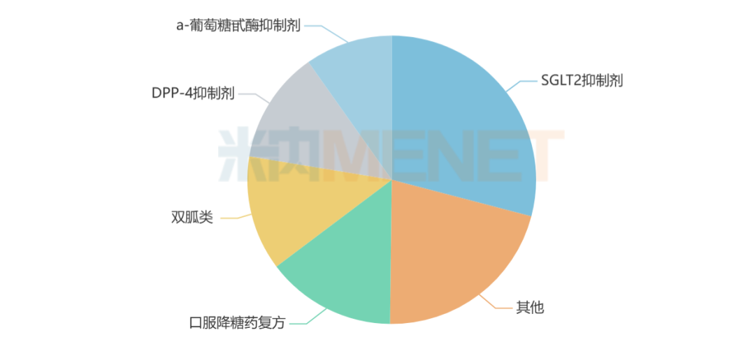 糖尿病化药细分11个治疗小类,SGLT2抑制剂(达格列净、恩格列净等)以超20%的市场份额领跑,口服降糖药复方(吡格列酮二甲双胍、西格列汀二甲双胍等)、双胍类(二甲双胍等)、DPP-4抑制剂(西格列汀、利格列汀等)依次位列第二、第三、第四,市场份额均超过10%,a-葡萄糖甙酶抑制剂(阿卡波糖、米格列醇等)位列第五。