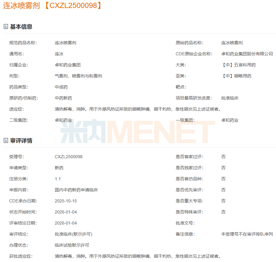 此外,卓和药业集团的中药1.1类新药连冰喷雾剂、无锡济煜山禾药业的中药改良型新药黄氏响声儿童喷雾剂获批临床,3个产品申请临床在审评审批中,广西馨海药业的JKN2303吸入溶液为中药1.2类新药,神威药业集团的双黄连吸入溶液、浙江维康药业的银黄吸入溶液为中药改良型新药。