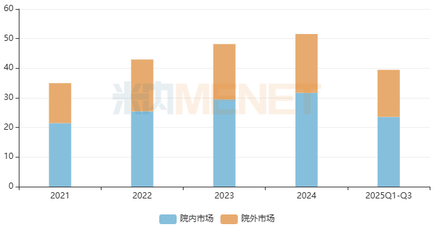 米内网数据显示,中成药气雾剂/喷雾剂与粉雾剂在近年中国三大终端六大市场(统计范围详见本文末)销售规模稳步攀升,2024年突破50亿元大关,2025年Q1-Q3同比增长1.53%。从细分渠道来看,院内市场(公立医院终端+公立基层医疗终端)是主力销售渠道;院外市场(零售药店:城市实体药店+网上药店)则持续增长。