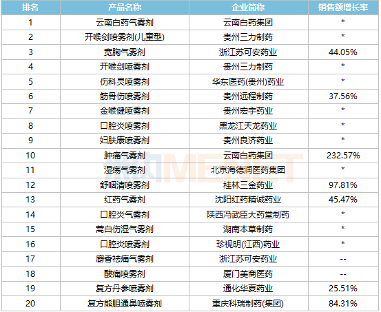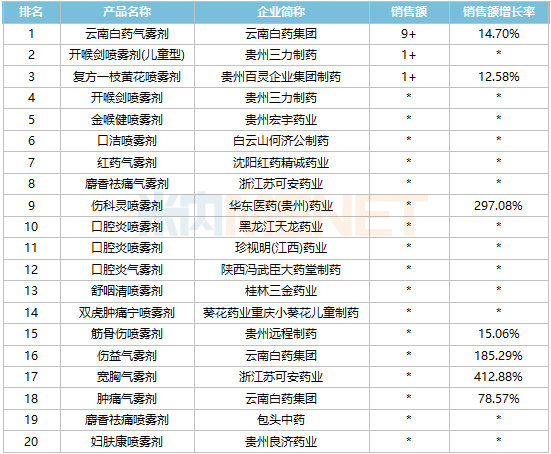 16个独家产品上榜,包括贵州三力制药的开喉剑喷雾剂、白云山何济公制药的口洁喷雾剂、华东医药(贵州)药业的伤科灵喷雾剂、桂林三金药业的舒咽清喷雾剂等。