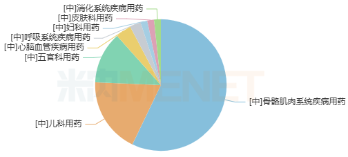 从大类格局来看,骨骼肌肉系统疾病用药市场份额最大,占比近60%;其次是儿科用药、五官科用药,占比均超过10%;心脑血管疾病用药、呼吸系统疾病用药、骨骼肌肉系统疾病用药均有双位数增速。