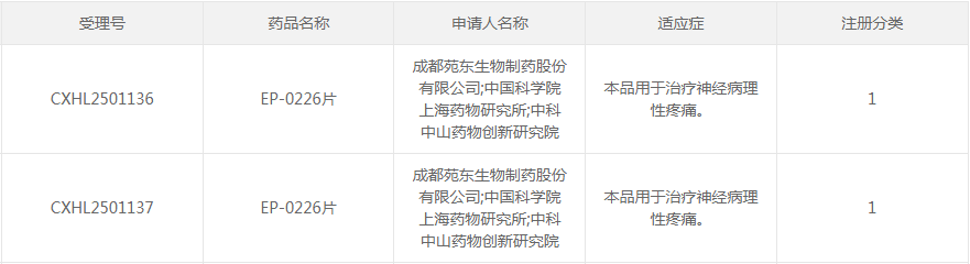 EP-0226片是由苑东生物和上海药物所、中山药创院联合开发的化药1类创新药,拟用于治疗神经病理性疼痛。米内网数据显示,该新药的临床申请(CXHL2501136/7)均于2025年10月获得承办,随后于2026年1月获得临床试验默示许可。