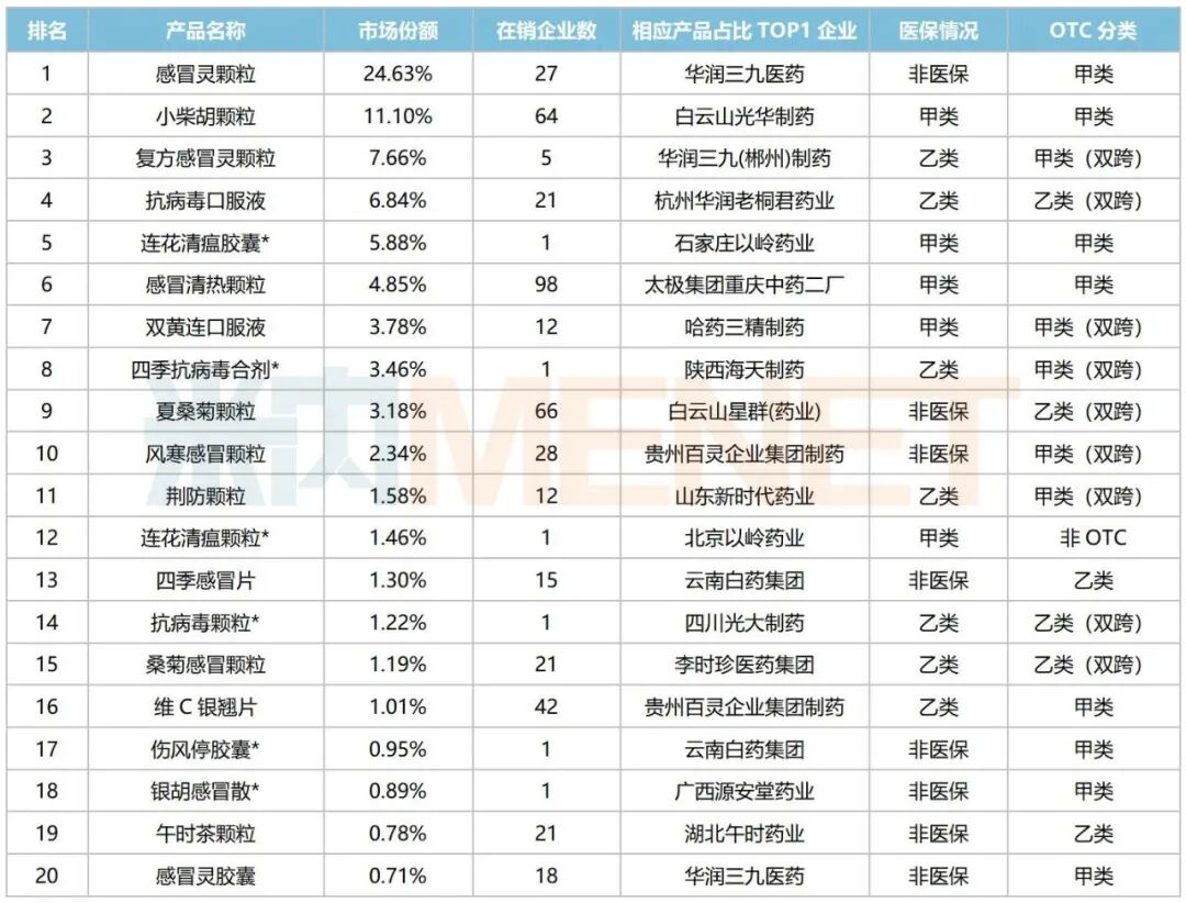 从企业层面看,20个产品中,华润三九有4个产品占据TOP1市场份额,分别为感冒灵颗粒、复方感冒灵颗粒、抗病毒口服液、感冒灵胶囊;以岭药业有2个独家品种上榜,云南白药有1个独家品种上榜,1个产品占据TOP1市场份额;广药集团、贵州百灵均有2个产品占据TOP1市场份额等。