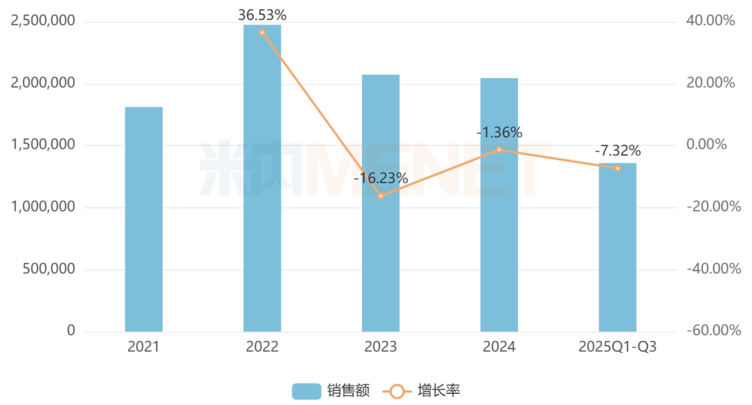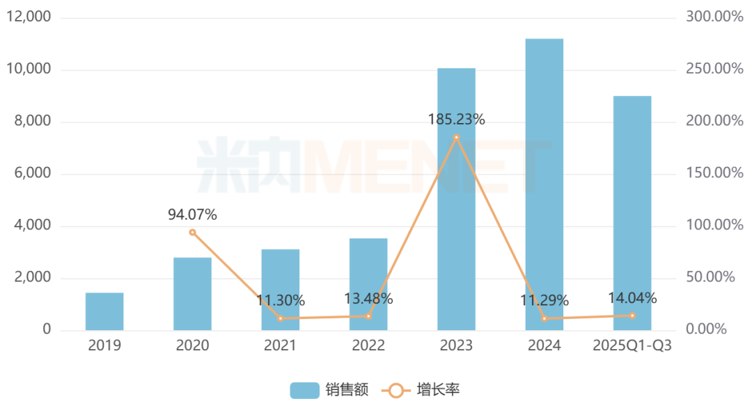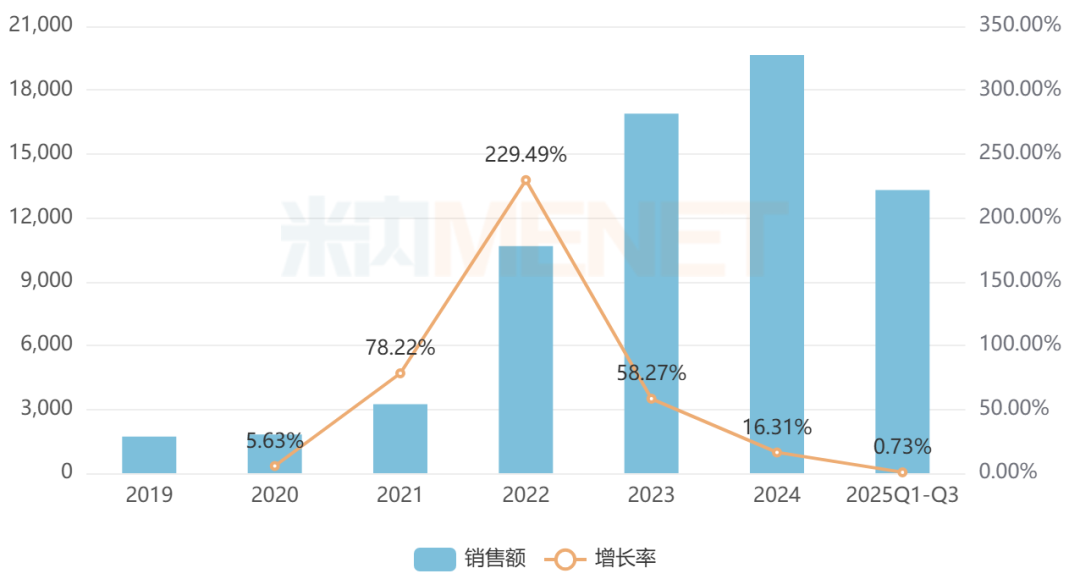 荆防颗粒为国家医保乙类、OTC甲类(双跨)品种,具有发汗解表、散风祛湿的功效,用于风寒感冒,头痛身痛,恶寒无汗,鼻塞清涕,咳嗽白痰等,该药有10余家企业拥有生产批文,2020年至今在中国零售药店终端的销售额呈持续正增长态势,2024年接近2亿元,2025年前三季度超过1.3亿元,由山东新时代药业主导市场。