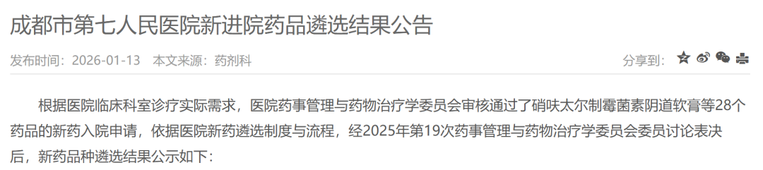 编辑说:日前,成都市第七人民医院发布公告,公示新进院药品遴选结果。其中,28个新药的入院申请审核通过,化学药、生物药、中成药均有涉及,既有2025年前三季度在中国公立医疗机构终端销售额超过20亿元的大品种,亦有多个销售额增速达三位数以上的潜力品种。