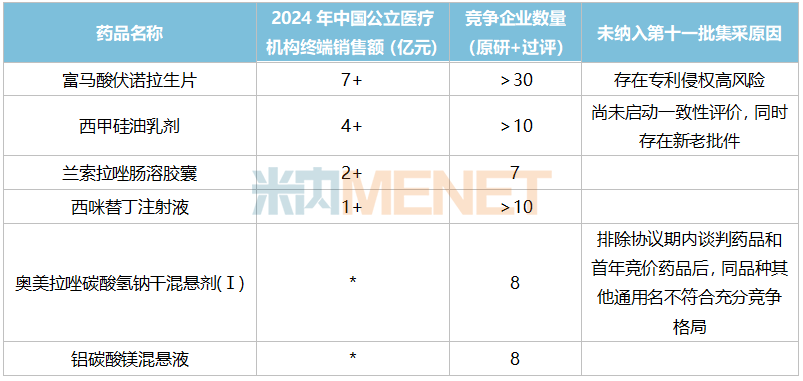值得注意的是,剩余的3个产品中,兰索拉唑肠溶胶囊和西咪替丁注射液2024年在中国公立医疗机构终端的销售额均达到了亿元级别,注射用兰索拉唑已纳入第五批集采,西咪替丁暂无任何剂型纳入集采。
