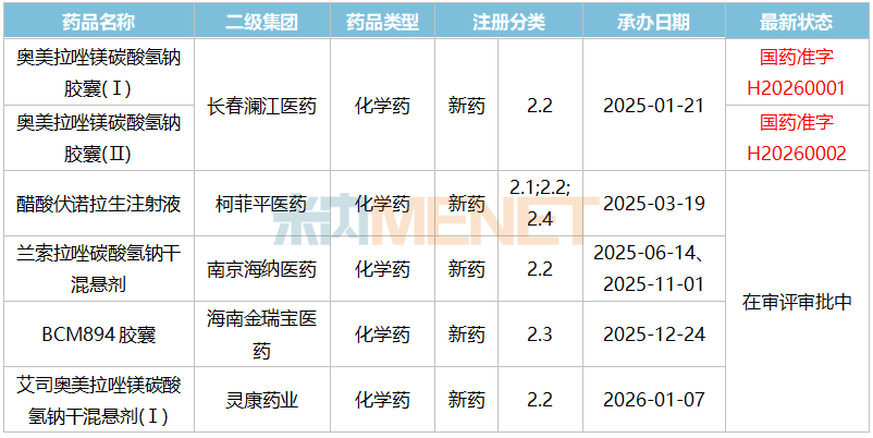 据米内网统计,2025年全年均无治疗与胃酸分泌相关疾病的药物新药获批(含1类、2类),今年1月5日,长春澜江医药的化药2.2类新药奥美拉唑镁碳酸氢钠胶囊(I)和奥美拉唑镁碳酸氢钠胶囊(II)成功获批,成为了该类药物市场2026年首批上市的新药。