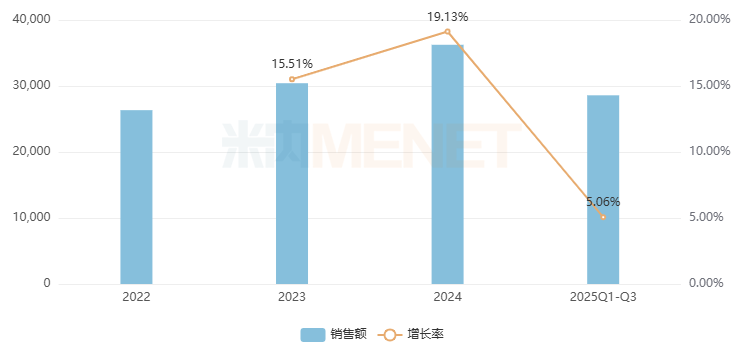 青峰医药旗下江西山香药业的艾司奥美拉唑镁肠溶片在2020年7月获批,2021年中标第四批集采后实现销售飞涨,2021年增长率高达16926.83%销售额达到了1.4亿元,2022-2024年分别增长了82.76%、15.51%、19.13%,2024年销售额升至3.6亿元新高,2025年Q1-Q3增速放缓至5.06%,销售额依然超过了2.8亿元。