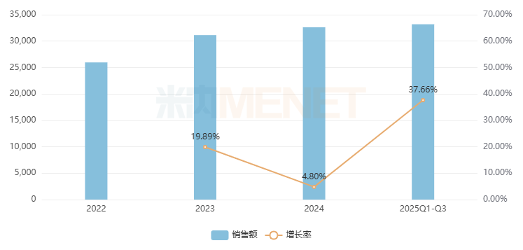 硫糖铝混悬凝胶是昆明积大制药的独家产品,现为2025版国家医保常规目录乙类品种。在中国公立医疗机构终端,该产品自从2014年起一直保持正增长态势,2017年销售额突破1.2亿元,2021年涨至2.2亿元,2023年冲上3亿元梯队,2025年Q1-Q3猛涨37.66%销售额已超过2024年全年的3.3亿元,潜力不容小觑。