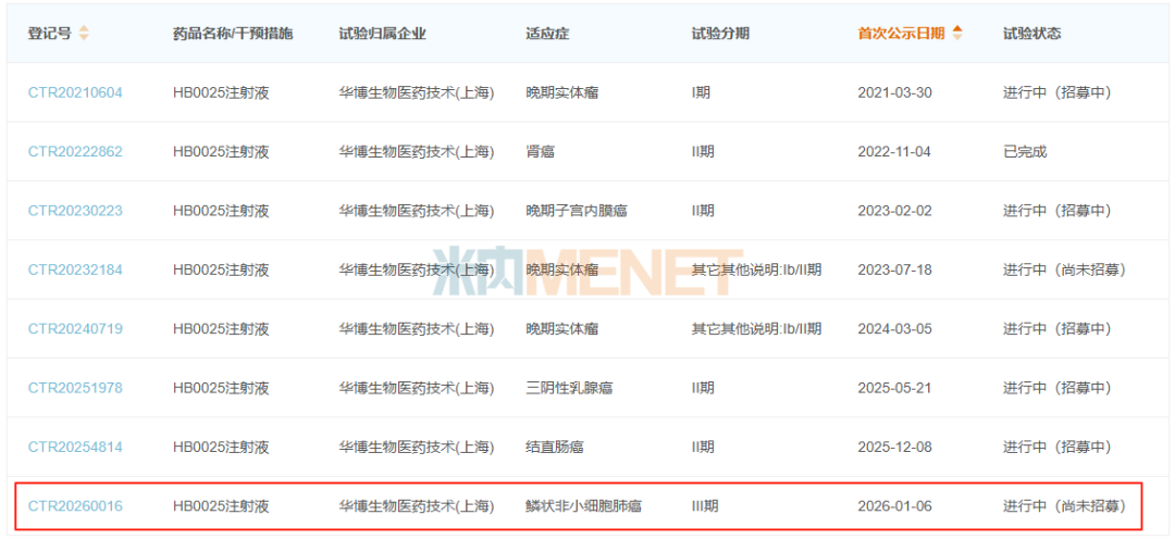 2026年1月,HB0025注射液正式启动鳞状非小细胞肺癌III期临床试验。早前,该新药的肾癌II期临床试验已在2024年4月完成,而该新药的晚期子宫内膜癌、三阴性乳腺癌、结直肠癌等适应症正在开展II期临床试验。