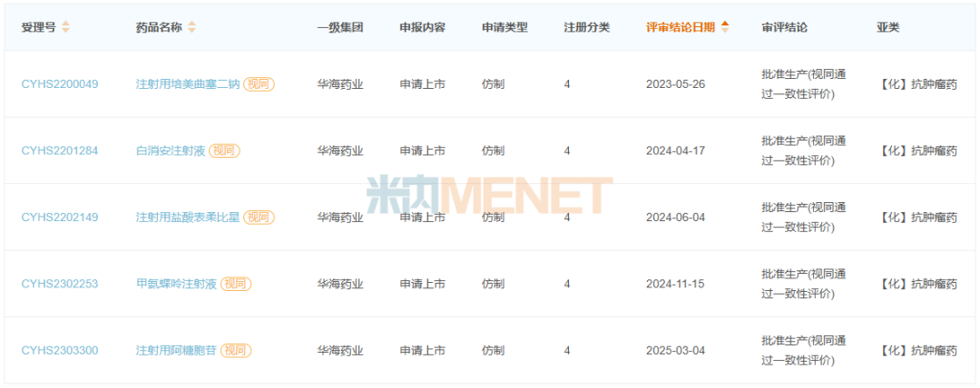 米内网数据显示,2023年5月,华海药业的注射用培美曲塞二钠获批上市,成为了公司首个上市的抗肿瘤药,截至目前公司已获批了5款抗肿瘤药,均为化药仿制药。
