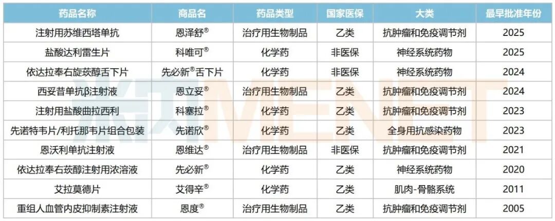 含引进的产品在内,目前先声药业已有10款创新药在国内获批上市,包括6款小分子化学药及4款生物药,涵盖抗肿瘤和免疫调节剂、神经系统药物、全身用抗感染药物、肌肉-骨骼系统等治疗大类。