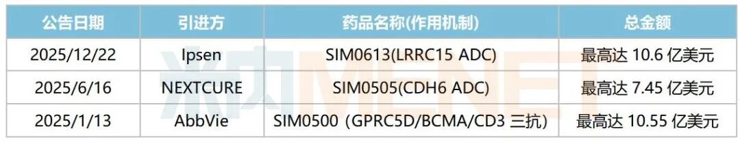 2025年12月,先声药业与Ipsen签订了独家授权许可协议,将SIM0613(LRRC15 ADC)在大中华区以外地区的全球独家开发、生产及商业化权利独家授权给Ipsen。先声药业有权收取最高达10.6亿美元的款项,其中包括4500万美元的首付款,以及研发、监管及商业化里程碑付款,另可收取分级销售特许权使用费。