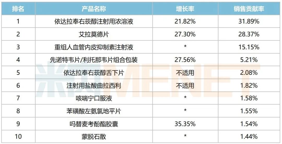 米内网数据显示,2025年前三季度中国三大终端六大市场(统计范围详见本文末)先声药业销售额TOP10产品中,有6款创新药上榜,其中依达拉奉右莰醇注射用浓溶液、艾拉莫德片、重组人血管内皮抑制素注射液2024年销售额均超过10亿元,2025年前三季度分别超过18亿元、16亿元、8亿元。