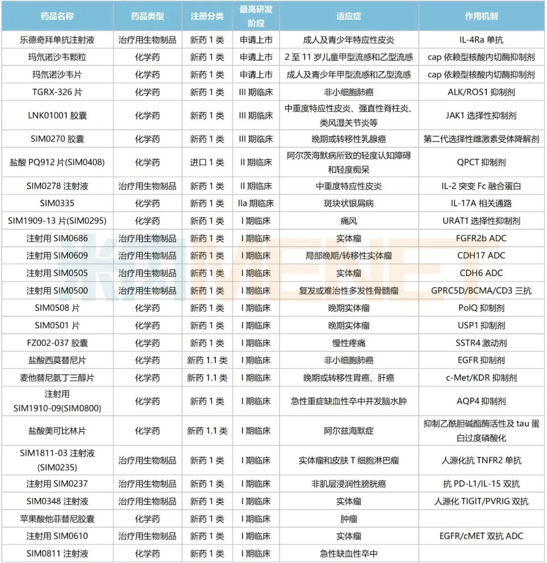 1类新药方面,乐德奇拜单抗注射液(IL-4Ra单抗)、玛氘诺沙韦颗粒(cap依赖型核酸內切酶抑制剂)、玛氘诺沙韦片(cap依赖型核酸內切酶抑制剂)申报NDA获受理;注射用SIM0505(CDH6 ADC)、注射用SIM0686(FGFR2b ADC)、注射用SIM0609(CDH17 ADC)、SIM0811注射液、注射用SIM0610(EGFR/cMET双抗ADC)等首次获批临床等。