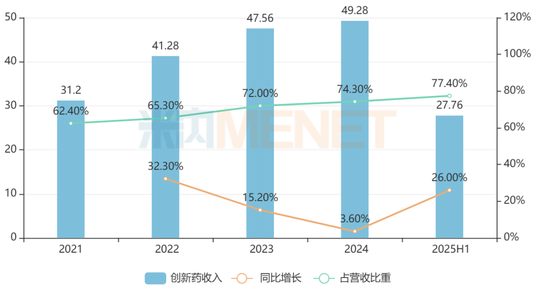 随着越来越多的创新药上市销售,先声药业创新药收入呈现持续且快速增长的态势,由2020年的20.29亿元上涨至2024年的49.28亿元,2025年有望再创新高;此外,创新药收入占营收比重逐年提升,由2018年的约26%攀升至2025年上半年的约77%。