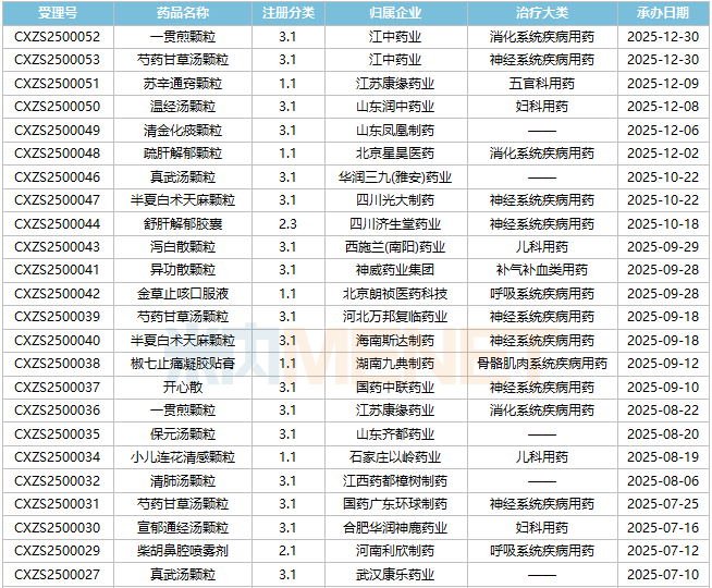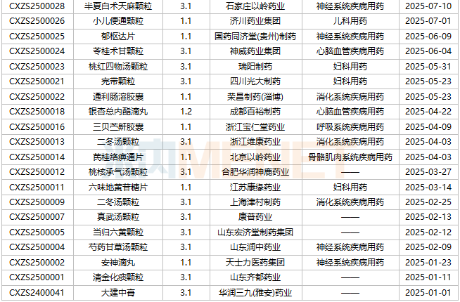从注册分类来看,中药1.1类新药有6款;中药3.1类新药有17款、中药3.2类新药有1款;中药2.1类新药、中药2.2类新药各1款。