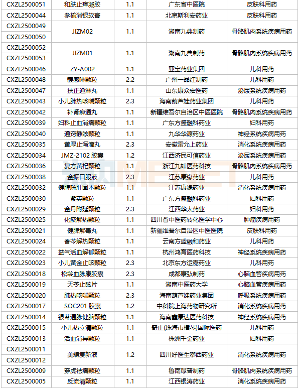 2025年国内共有98款中药新药获得临床试验默示许可。从治疗大类来看,骨骼肌肉系统疾病用药、儿科用药、呼吸系统疾病用药、妇科用药、神经系统疾病用药、心脑血管疾病用药火热,均有10款及以上产品。