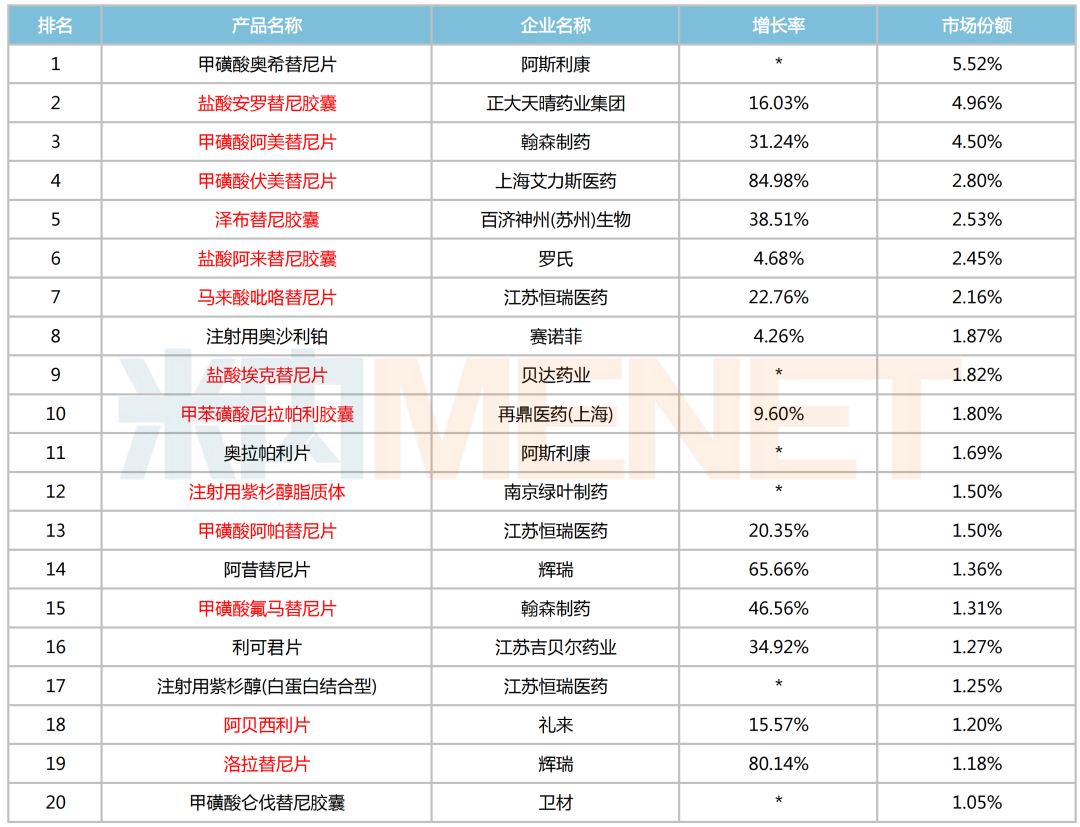 16个品牌销售额呈正增长,有11个涨幅达两位,包括:艾力斯的甲磺酸伏美替尼片暴涨84.98%、翰森制药的甲磺酸氟马替尼片大涨46.56%、百济神州的泽布替尼胶囊、吉贝尔药业的利可君片和翰森制药的甲磺酸阿美替尼片均涨逾30%、恒瑞医药的马来酸吡咯替尼片和甲磺酸阿帕替尼片均涨超20%。