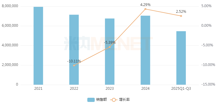 米内网数据显示,在中国城市公立医院、县级公立医院、城市社区中心以及乡镇卫生院(简称中国公立医疗机构)终端,抗肿瘤化药2021年创下历史新高的近800亿元,随后2023-2024年呈逐年下滑趋势,2024年重现上涨达700亿元以上,2025Q1~Q3保持增长至超540亿元,全年将向超720亿元发起冲击。