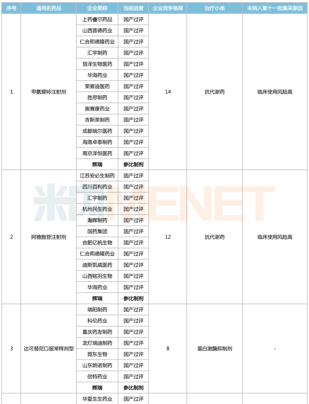 从过评企业上看,汇宇制药、重庆药友制药各有3个过评品种在列,国药集团、华海药业、成都瑞尔医药、四川百利药业、仁合熙德隆药业、石家庄荣雾迪医药等均有2个过评品种。
