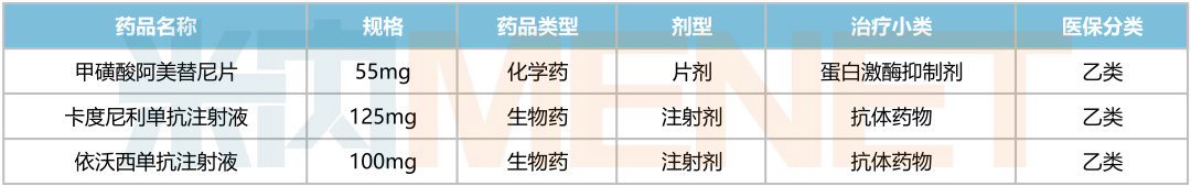 拟遴选进院新药包含1款化药和2款生物药,均为1类新药及医保乙类药品种;从剂型上看,注射剂、片剂各占2个和1个席位;按治疗小类统计,抗体药物有2个产品在列,蛋白激酶抑制剂有1个产品。