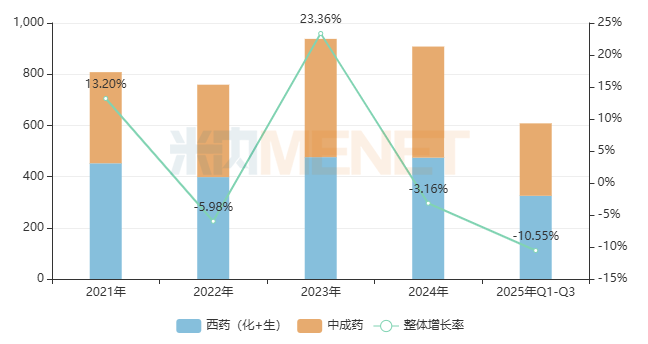 从药品类别来看,西药(化+生)2025年Q1-Q3下滑了9.27%,销售额为325亿元左右,中成药的跌幅为11.98%,高于平均水平,销售额为283亿元左右,呼吸系统中成药压力倍增。