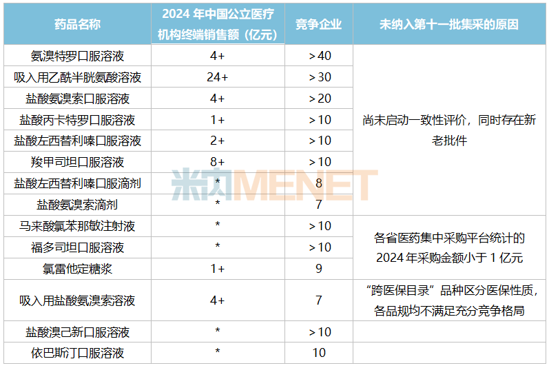 盐酸溴己新口服溶液和依巴斯汀口服溶液2024年在中国公立医疗机构终端的销售额均未到亿元级别,目前竞争企业(原研+过评)均达到了10家及以上,盐酸溴己新注射液已纳入第十一批集采,依巴斯汀片在第七批集采中标。