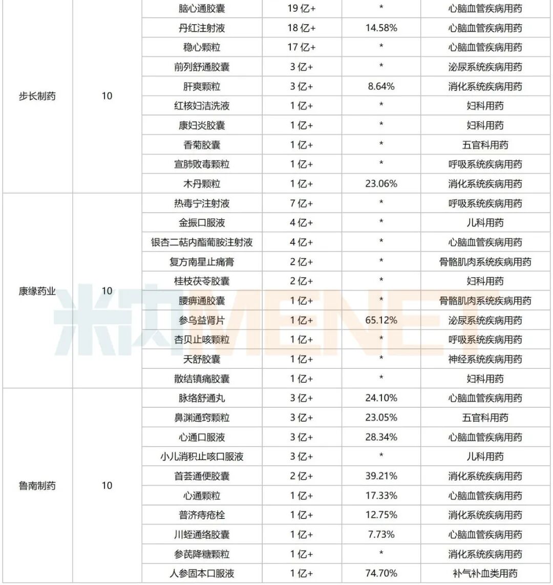 华润医药以17个品种领跑,国药集团以13个品种紧接其后,步长制药、康缘药业、鲁南制药以10个品种并列第三;此外,上药集团、远大健康、扬子江药业、以岭药业、广药集团、济川药业、津药达仁堂、方盛制药等15家药企均有3个及以上的品种在列。