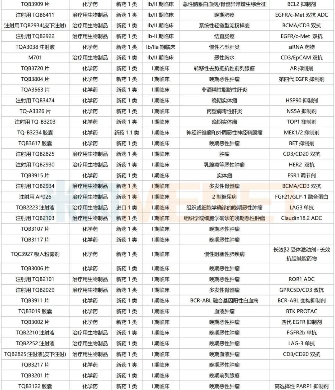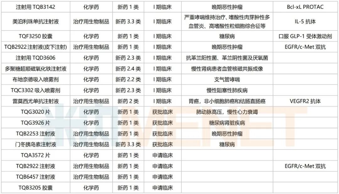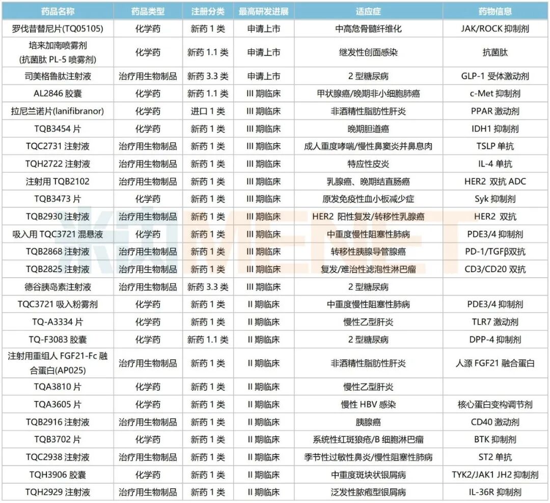 此外,AL2846胶囊(c-Met抑制剂)、拉尼兰诺片(PPAR激动剂)、TQB3454片(IDH1抑制剂)、TQC2731注射液(TSLP单抗)、TQH2722注射液(IL-4单抗)、注射用TQB2102(HER2 双抗ADC)、TQB3473片(Syk抑制剂)、TQB2930注射液(HER2 双抗)、吸入用TQC3721混悬液(PDE3/4抑制剂)、TQB2868注射液(PD-1/TGFβ双抗)、TQB2825注射液(CD3/CD20双抗)等11款1类新药已处于III期临床阶段,上市可期。