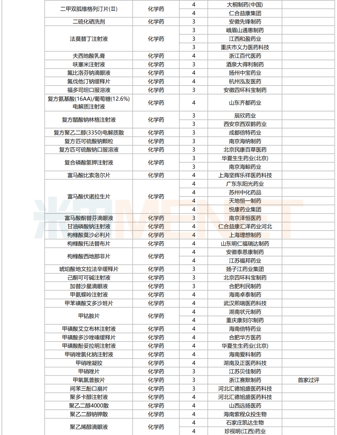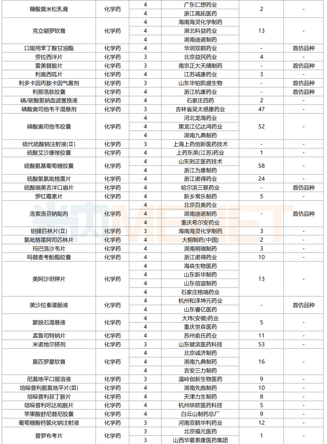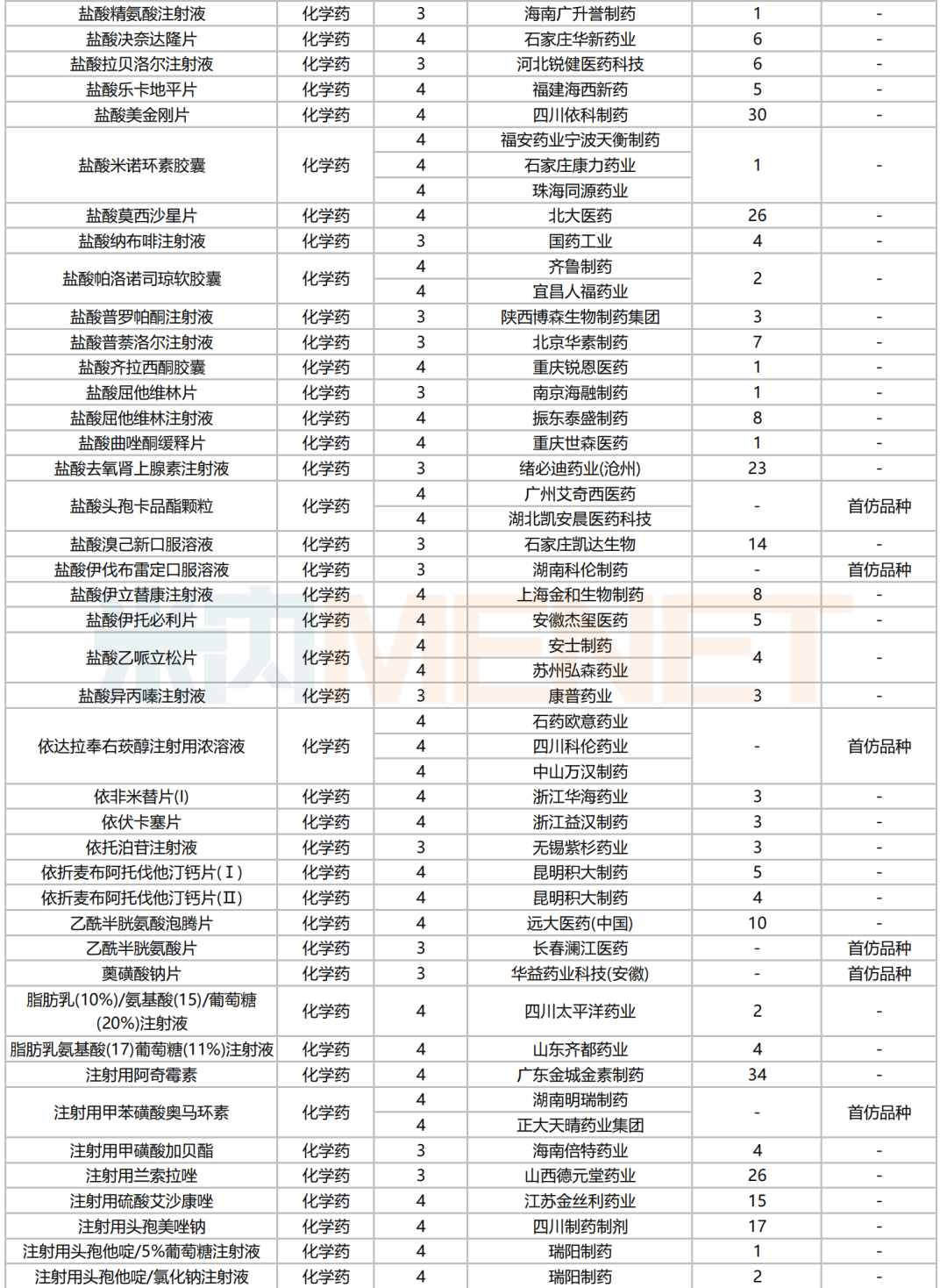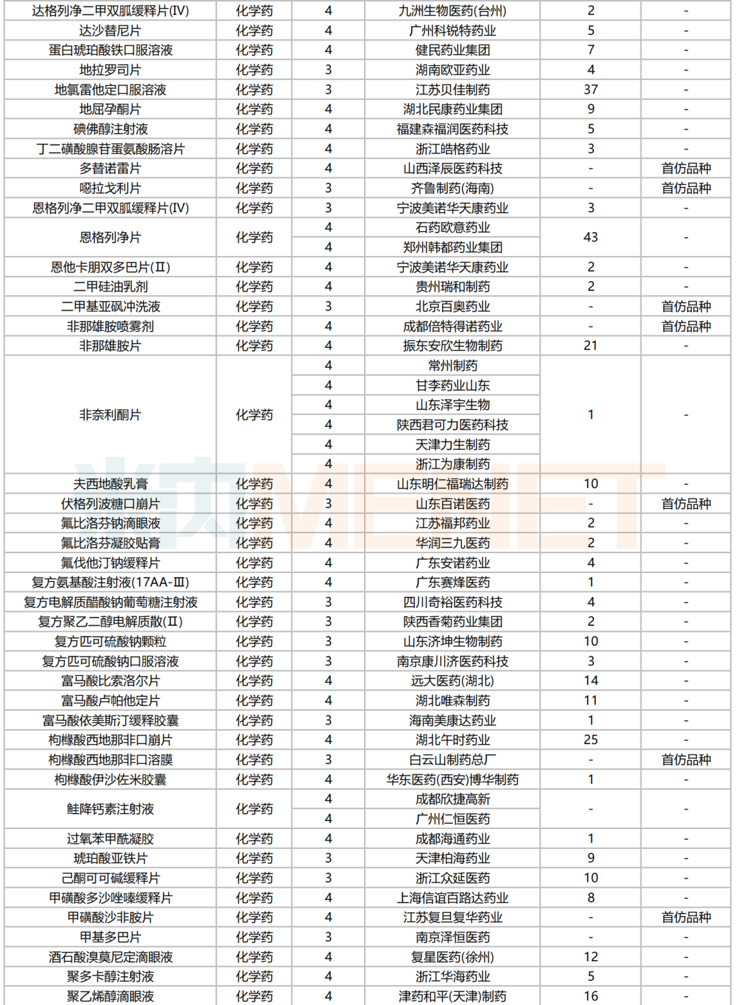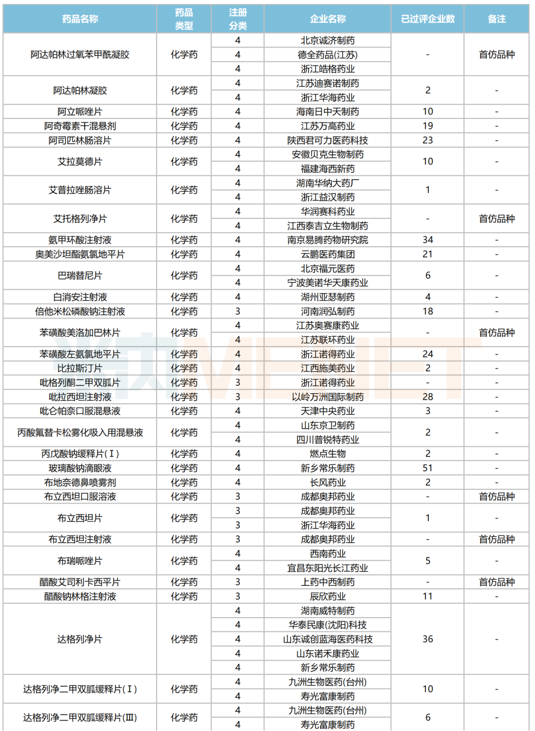 212个品种按新分类仿制申请获批并视同过评,29个品种按存量品种一致性评价补充申请过评。其中12个品种为首家过评。阿齐沙坦氨氯地平片(上海汇伦医药)、苯磺酸氨氯地平口崩片(广东万泰控股)、布瑞哌唑口崩片(齐鲁制药)、头孢托仑匹酯片(福安药业庆余堂制药)、妥洛特罗贴剂(北京泰德制药)、溴吡斯的明口服溶液(上药中西制药)、盐酸溴己新吸入溶液(合肥国药诺和药业)、依伏卡塞片(杭州仟源保灵药业、江西科睿药业)、注射用磷酸左奥硝唑酯二钠(华创合成制药)等9个品种为首仿品种。