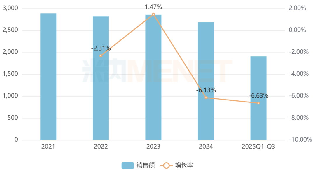 受集采深化冲击、基药制度引导、价格治理施压、监控药市场压缩以及创新药下沉相对不足等因素影响,我国县级公立医院药品市场再度承压。米内网数据显示,其2024年销售规模超2600亿元,同比下跌6.13%;2025Q1~Q3继续以6.63%的降幅下滑至约1900亿元。