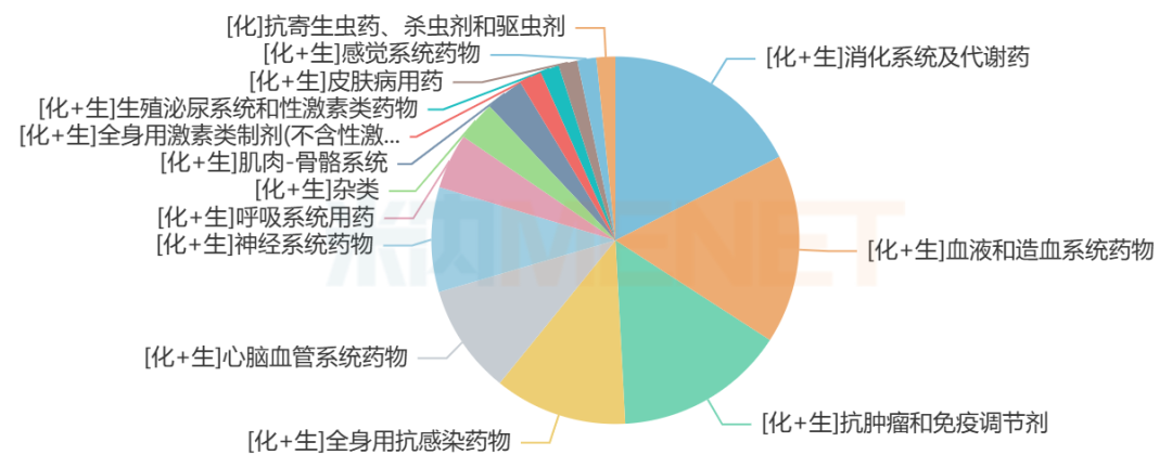 从化药及生物药大类格局上看,消化系统及代谢药、血液和造血系统药物“旗鼓相当”,均以超17%的市占比高居前二;抗肿瘤和免疫调节剂排名第三,市场份额超15%;全身用抗感染药物排名第四,市场份额约12%。